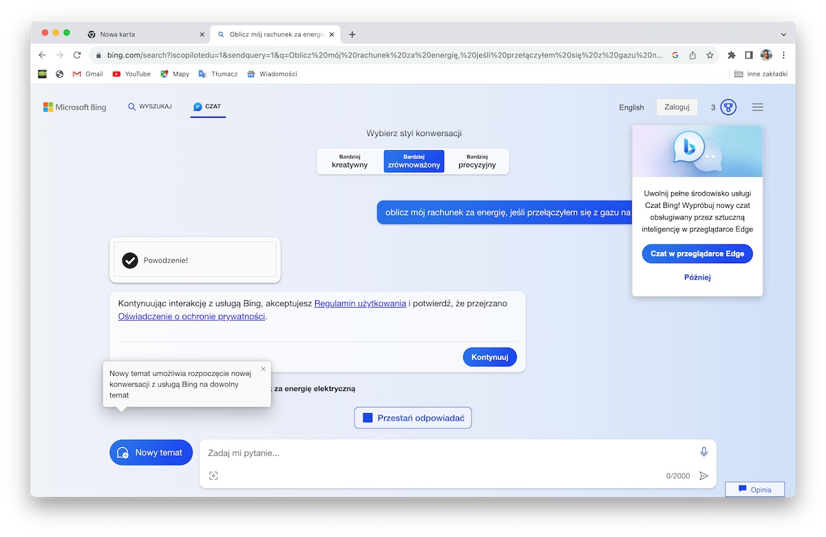 Jak można wykorzystać możliwości Bing Chat? Dowolnie, to model AI oparty na ChatGPT. Zwraca więc wyniki zapytań w taki sam sposób jak on. Taka integracja to sukces Microsoftu. Dzięki niej wyszukiwarka Bing dostała drugie życie i wielu nowych użytkowników.
