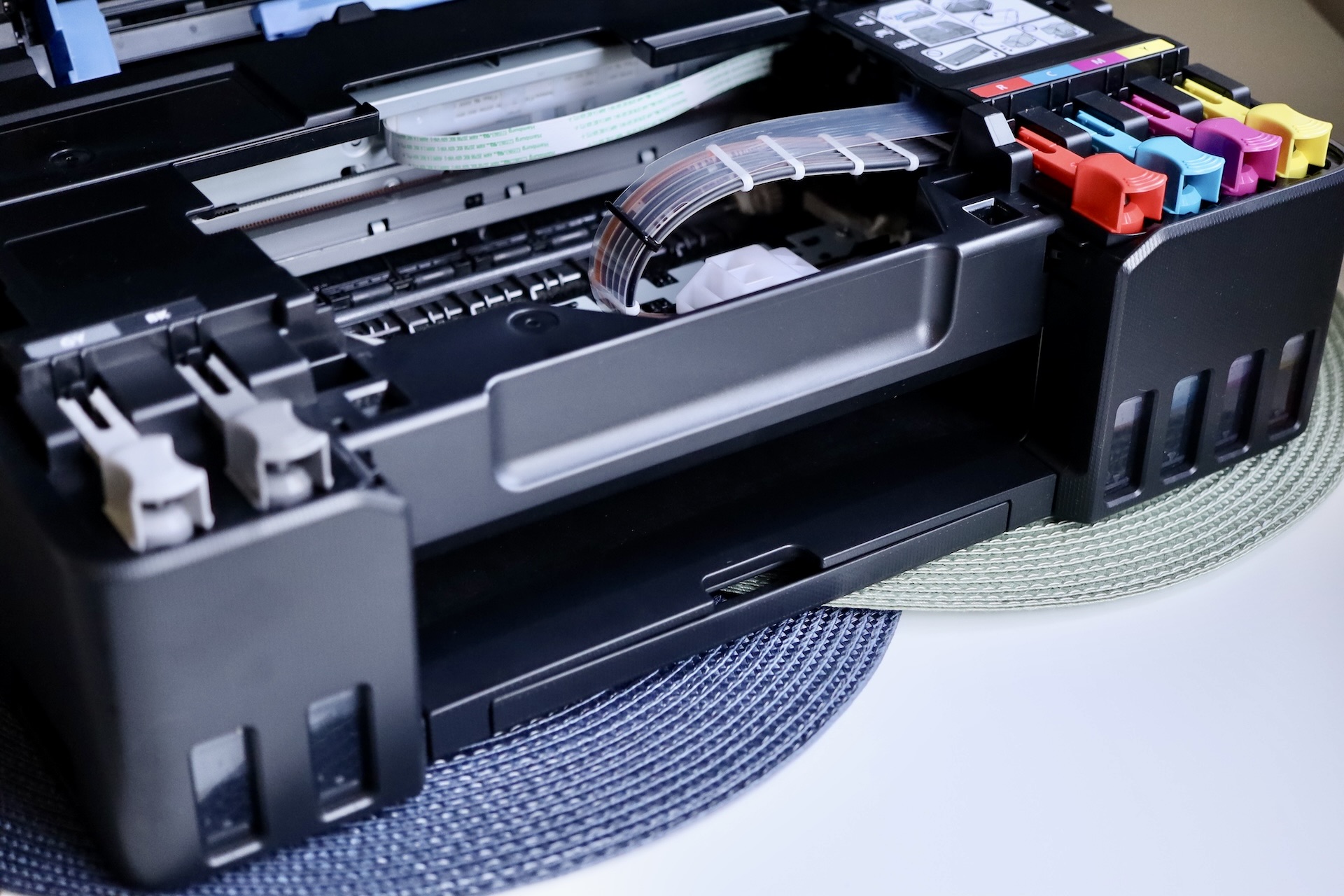 O zaletach systemu MegaTank pisałem przy okazji artykułów o Canon MAXIFY GX4040 oraz Canon MAXIFY GX6040. Canon MegaTank to system, w którym zwykłe wkłady z atramentem zastąpiono systemem dużych wewnętrznych zbiorników. Można je łatwo uzupełnić samemu, nie obawiając się o pobrudzenie.