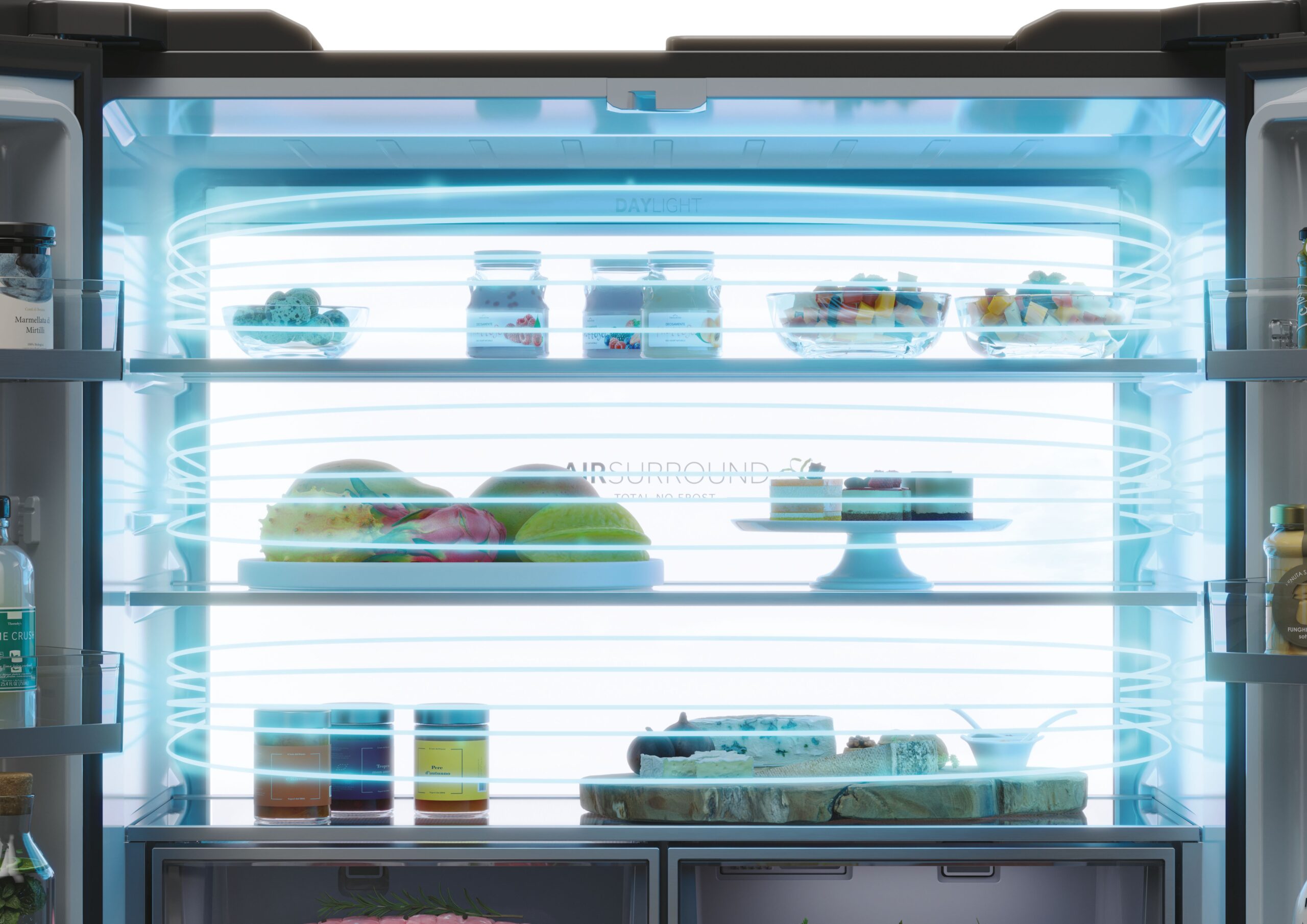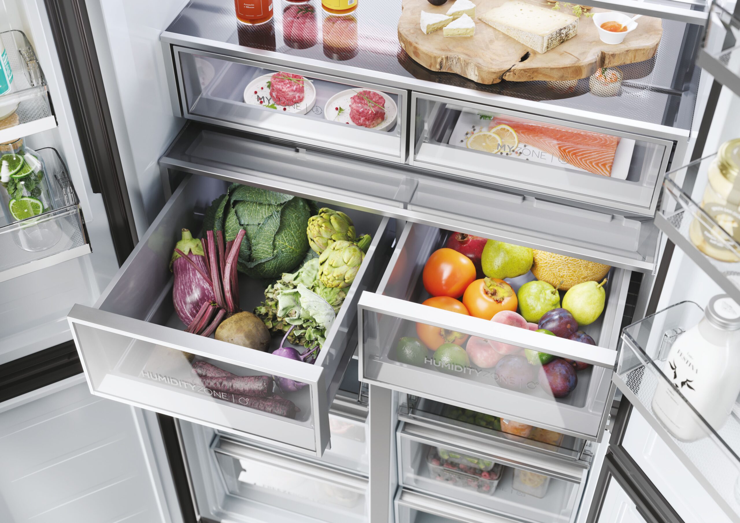 Całe wnętrze chłodziarko-zamrażarki zaprojektowane jest tak, by zagwarantować najbardziej optymalne warunki przechowywania w zależności od rodzaju produktu. Dla owoców i warzyw stworzone zostały dwie szuflady Humidity Zone utrzymujące świeżość delikatnej żywności dwa razy dłużej. Membrana z włókien roślinnych sprawia, że w szufladach wilgotność jest na poziomie 90% i automatycznie nią zarządza. Co przyczynia się do tego, że twoje ulubione owoce sezonowe i warzywa na dłużej zachowają swoje wartości odżywcze.
