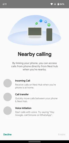 W Androidzie 13, a konkretnie w jego wersji testowej pojawiła się aplikacja “Cross-Device Communication Service”, która po uruchomieniu pokazuje możliwość połączenia telefonu z Nest Hubem. Dzięki temu można byłoby odbierać połączenia z telefonu na ekranie oraz także je rozpoczynać. Nie powinno być także problemu z przełączaniem urządzeń.