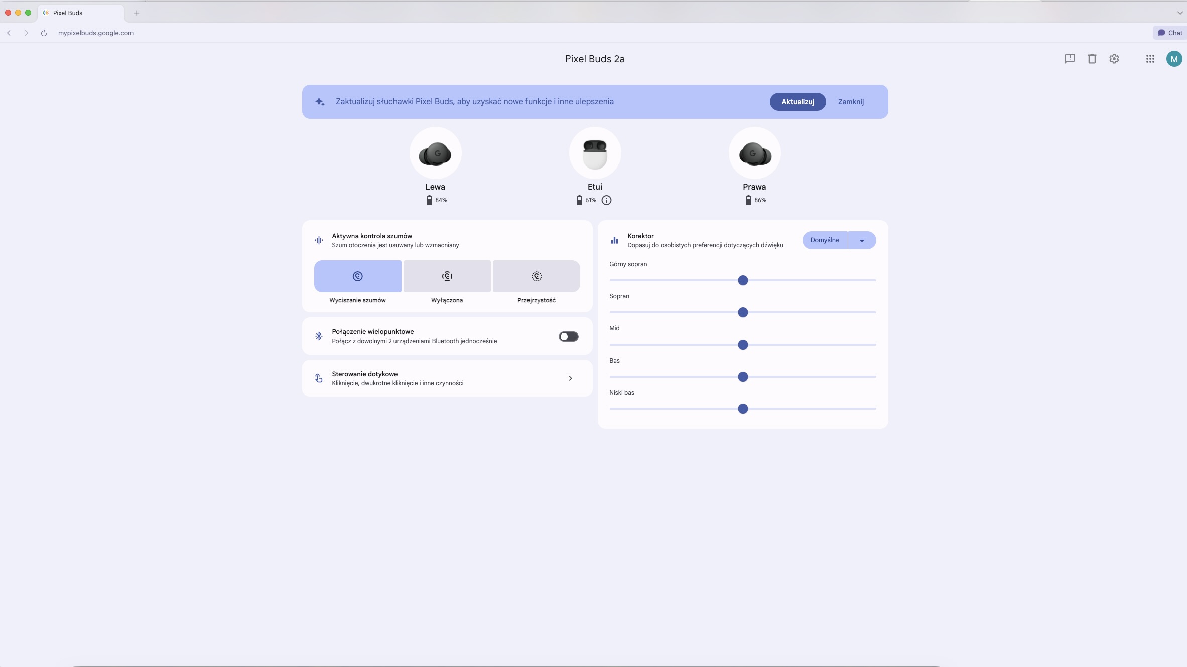 Oczywiście, by móc sterować equalizerem czy zmienić ustawienia obsługi dotykowej wymagana będzie aplikacja. I tu Google kolejny raz bardzo mnie zaskoczyło. Okazuje się, że ze słuchawkami można połączyć się przez przeglądarkę, zatem ustawienia da się swobodnie modyfikować także z poziomu komputera. Jak dotąd byłem przyzwyczajony do tego, że słuchawki takich firm jak Huawei, Oppo czy Baseus da się rzecz jasna połączyć z MacBookiem czy laptopem z Windows, ale wszelkich modyfikacji można dokonać tylko na smartfonie. Tym razem jednak Google Pixel Buds 2a pokazały mi, że da się to zrobić tak naprawdę z każdego urządzenia. I tu rzeczywiście, wymagane jest konto Google.