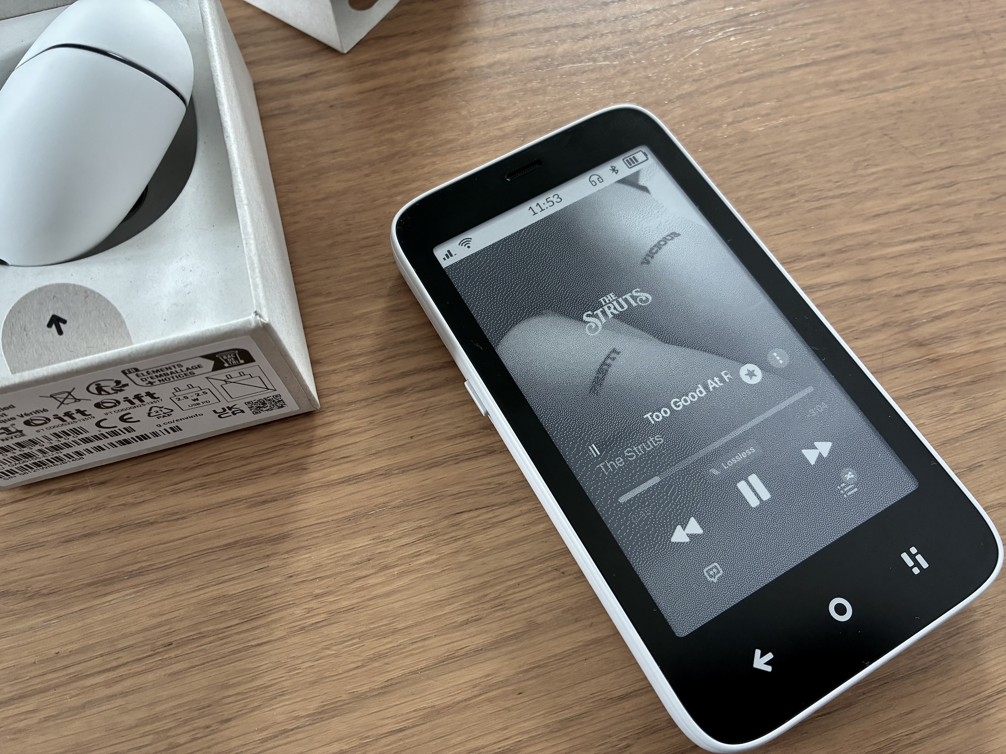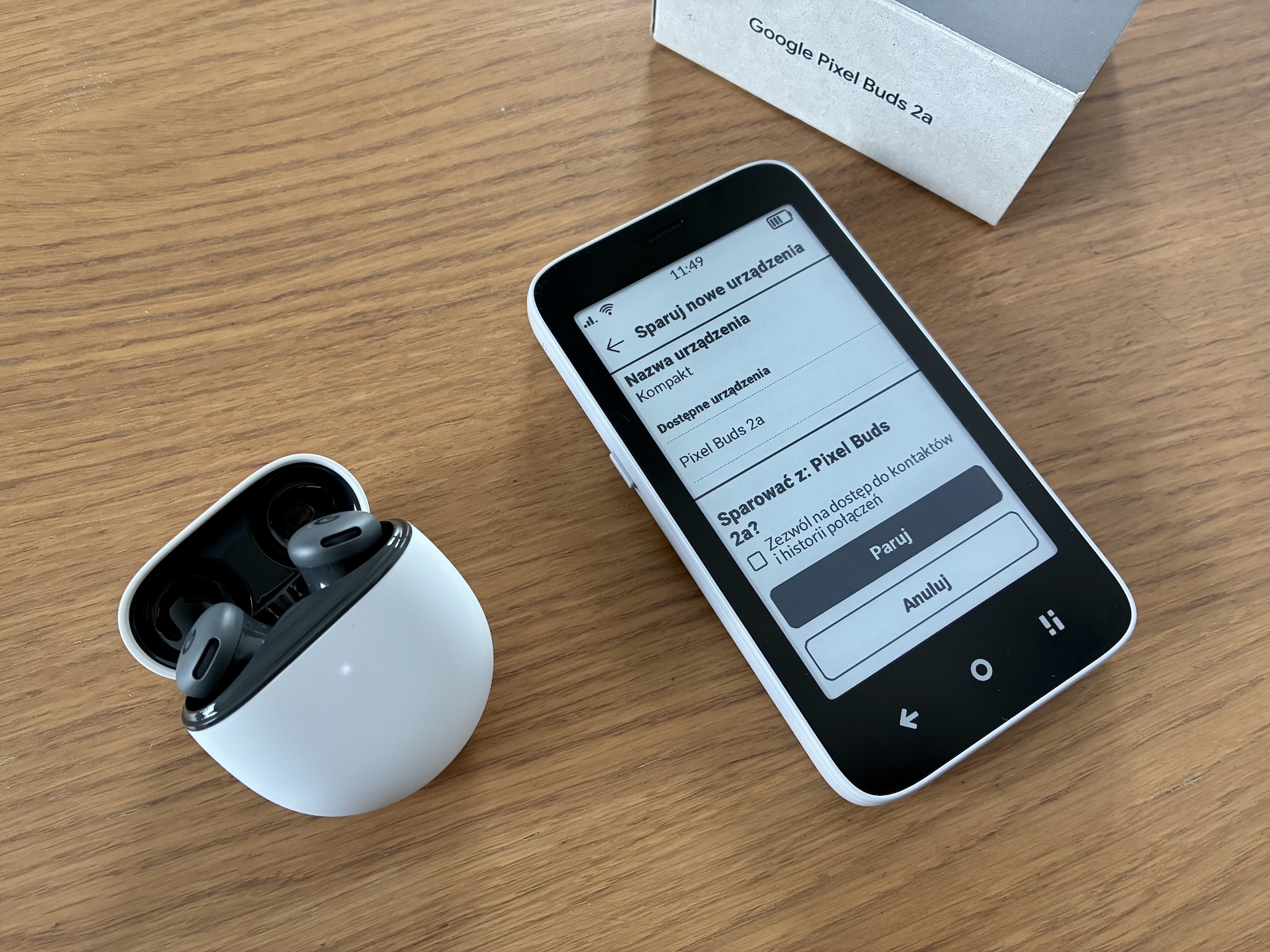 Napis na opakowaniu mówi, że słuchawki wymagają urządzenia z system Android 6.0 lub nowszym, konta Google i połączenia z internetem. Oczywiście samo sparowanie słuchawek z urządzeniem wyposażonym w Bluetooth jest możliwe bez spełnienia powyższych warunków. Pierwszą próbę podjąłem z Muditą Kompakt, z którą z sukcesem udało mi się jak dotąd połączyć AirPodsy czy Huawei FreeBuds Pro 4. Tak, jak zakładałem, nie było żadnego problemu, bo po kilku krótkich chwilach mogłem cieszyć się dźwiękiem streamowanym z tego minimalistycznego antysmartfona.