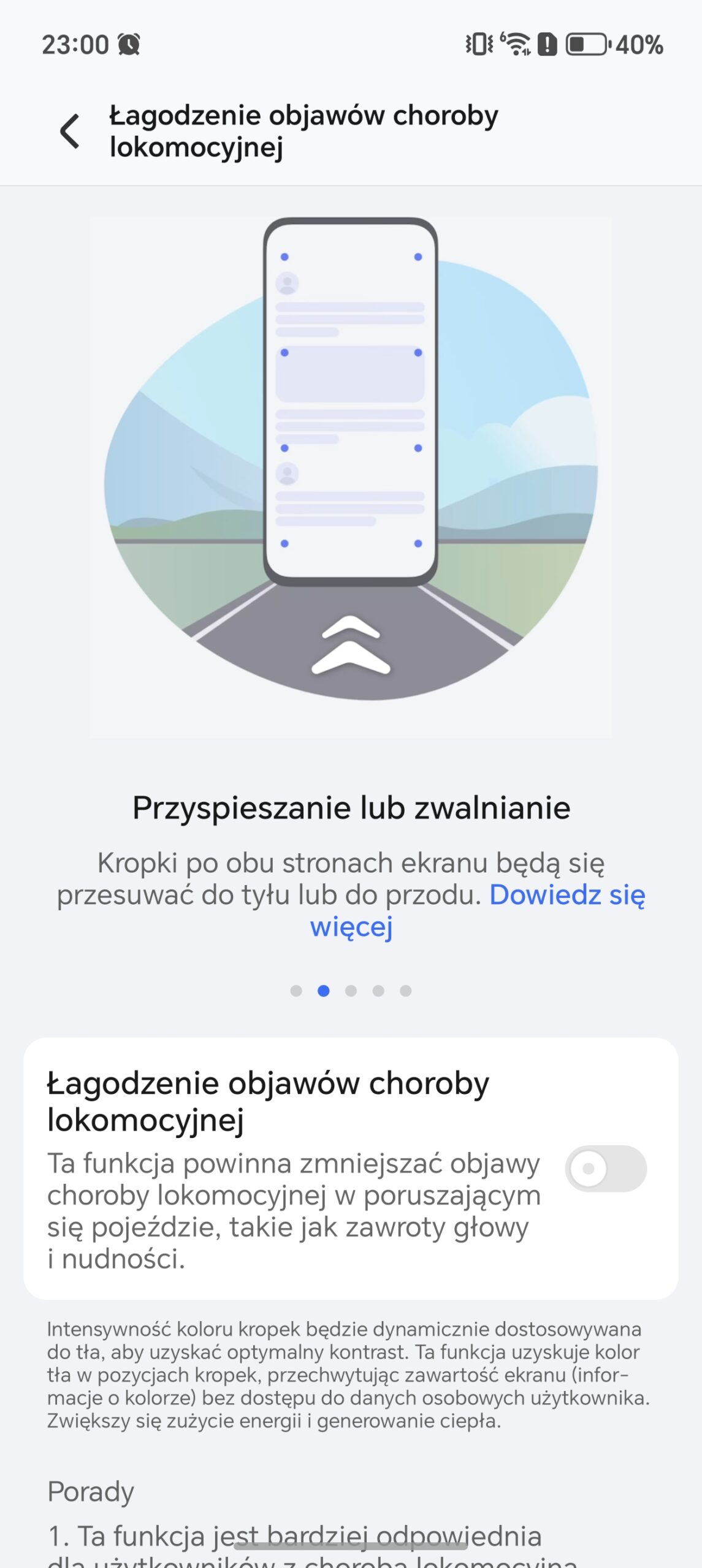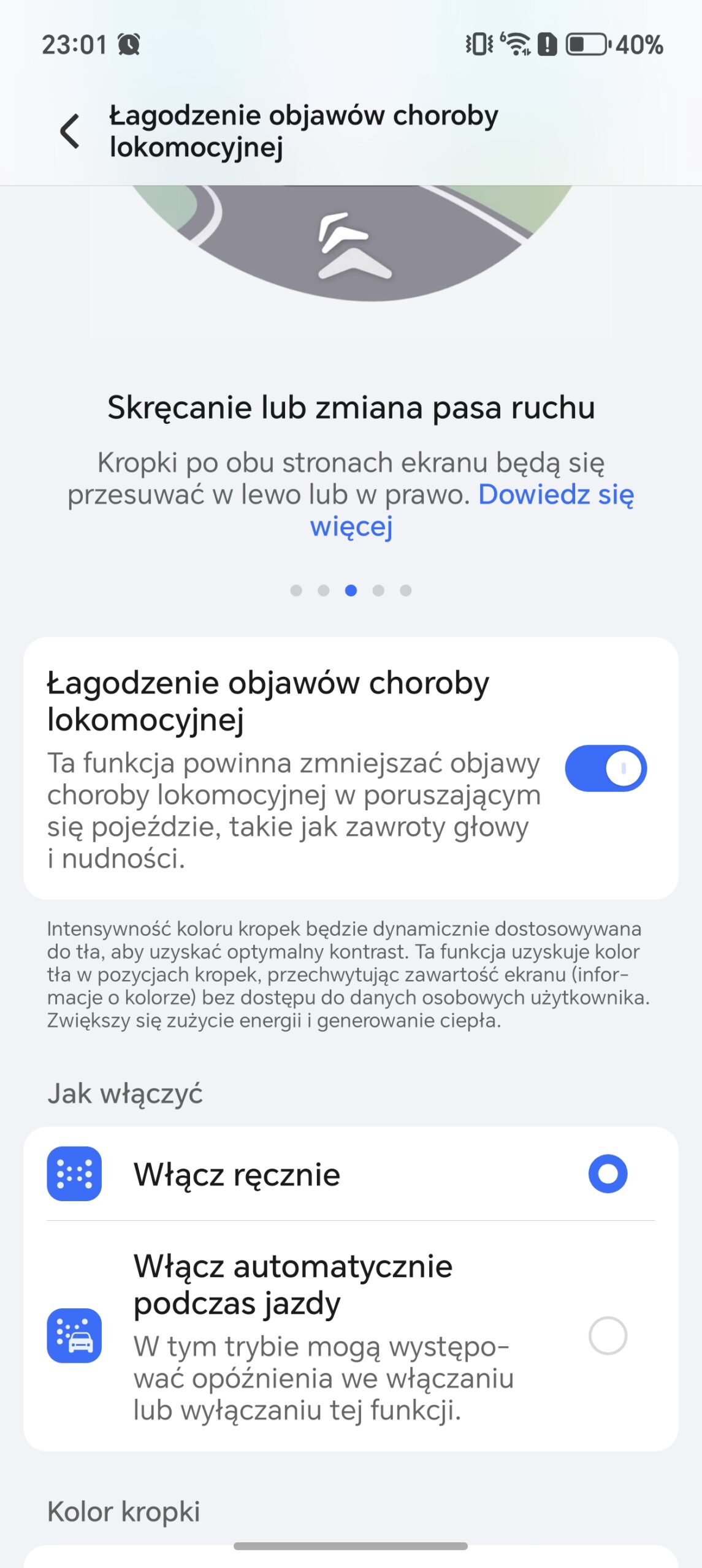 Osoby, które cierpią na chorobę lokomocyjną powinny zainteresować się dodatkowym ustawieniem, które może zniwelować objawy (takie jak zawroty głowy i nudności) w poruszającym się pojeździe. Bardzo ciekawa funkcja.