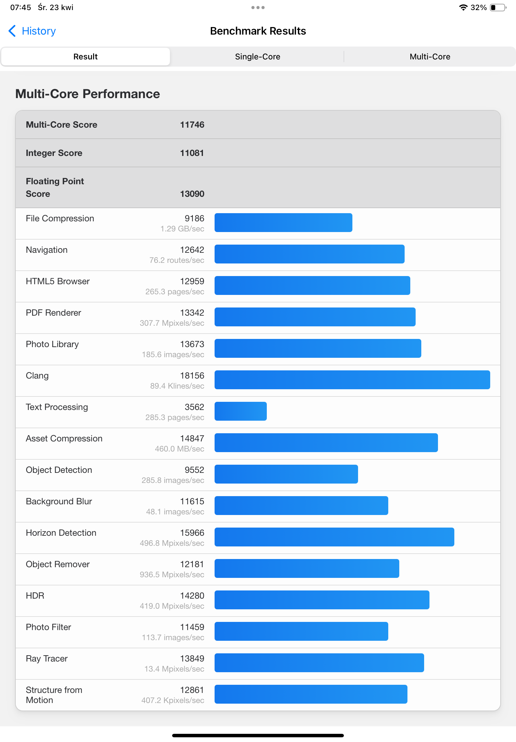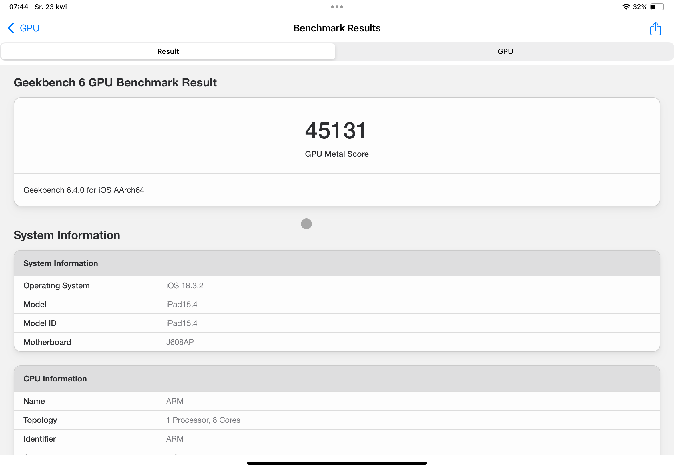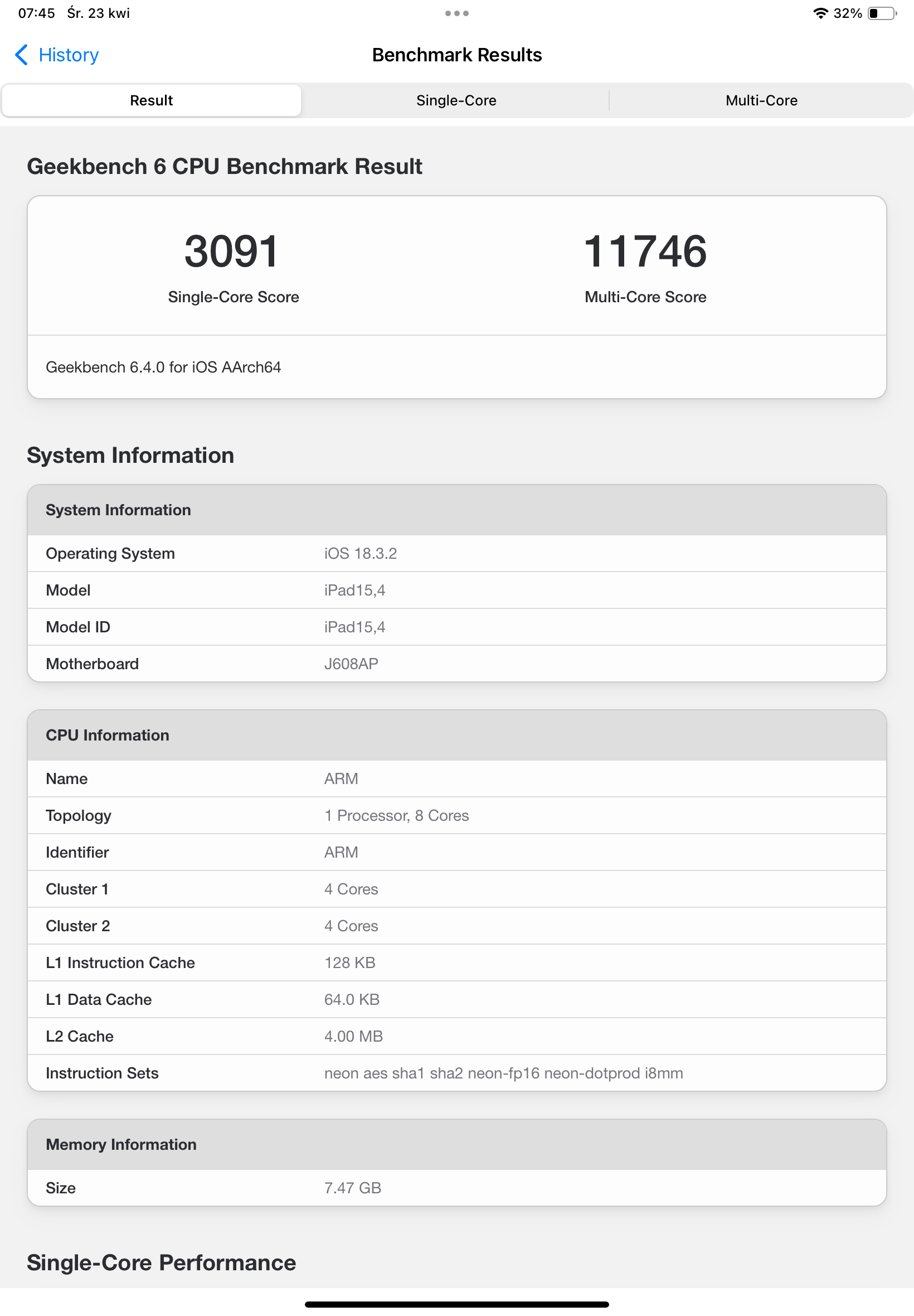 Wydajność to chyba cecha, o której najmniej lubię pisać, zwłaszcza w przypadku sprzętów od Apple. Na testowanym iPadzie Air 11 z M3 wszystko działa i to działa płynnie. Nie ma on żadnych problemów z edycją zdjęć w Lightroomie, montażem wideo w 4K czy grami, takimi jak chociażby najnowszy Assasins Creed. Na podstawie tego oceniałbym ten model i to oceniał dobrze, ale dla miłośników benchmarków mam parę screenów z Geekbencha.