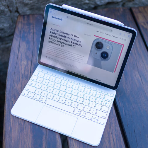 Poza niebieskim 11-calowym iPadem Air w wersji z Wi-Fi + Cellular oraz 1TB przestrzeni dyskowej dostałem do testów także zupełnie nowy Magic Keyboard oraz Apple Pencil Pro. Taki zestaw zastąpił mi na jakiś czas laptopa, więc przyjrzyjmy się także tym dwóm elementom. Magic Keyboard do złudzenia przypomina klawiaturę laptopów od Apple. Na tyle to podobne sprzęty, że orientowałem się, że to nie mój MacBook, jak nie działały skróty, które mam zdefiniowane na laptopie. Podłączana magnetycznie, oferująca wiele kątów nachylenia Magic Keybord kosztuje astronomiczne 1 399 złotych, jednak jak myślicie o potraktowaniu iPada jako sprzęt do pracy, to moim zdaniem warto rozważyć jej zakup, zwłaszcza jak w pracy piszecie, albo korzystacie z narzędzi, w których klawiatura może ułatwić wykonywanie zadań.