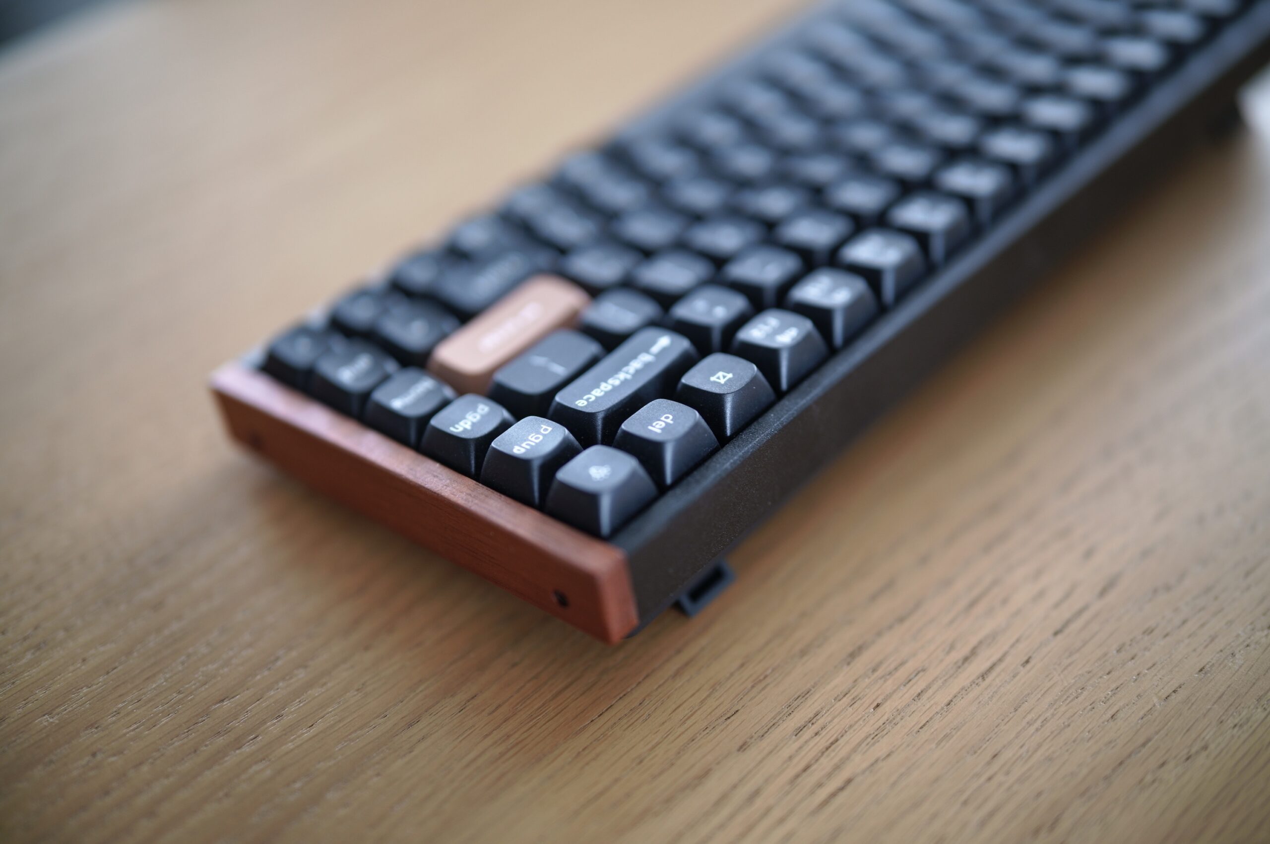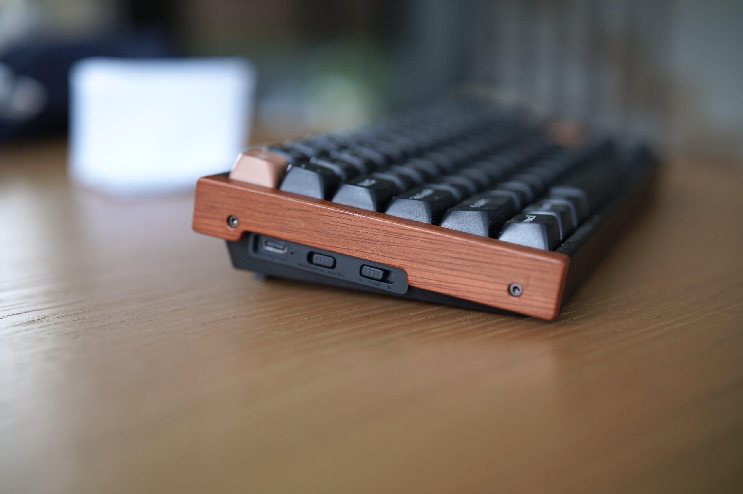 Przede wszystkim pierwszą cechą, która rzuca się w oczy w Keychron K2 HE to piękne wykończenie boków urządzenia. Nie mamy tutaj plastiku, a piękne, lakierowane… kawałki drewna (wersja Special Edition). O ile gdy widziałem podobne rozwiązania w autach, szczególnie końcówki lat 80-tych, to powodowały we mnie żołądkowe perturbacje, o tyle te w klawiaturze Keychron wyglądają obłędnie (albo to ja się szybko starzeje). Te małe akcenty dają świetne wrażenie na zdjęciach, a jeszcze lepsze na żywo, kiedy klawiatura spoczywa na blacie biurka. I mówcie co chcecie, ale ja jestem zachwycony i ten mały akcencik robi na mnie świetne wrażenie. Oczywiście to w wersji Special Edition, jeśli drewno Wam nie pasuje, możecie wziąć wersje bez tego elementu dekoracyjnego.