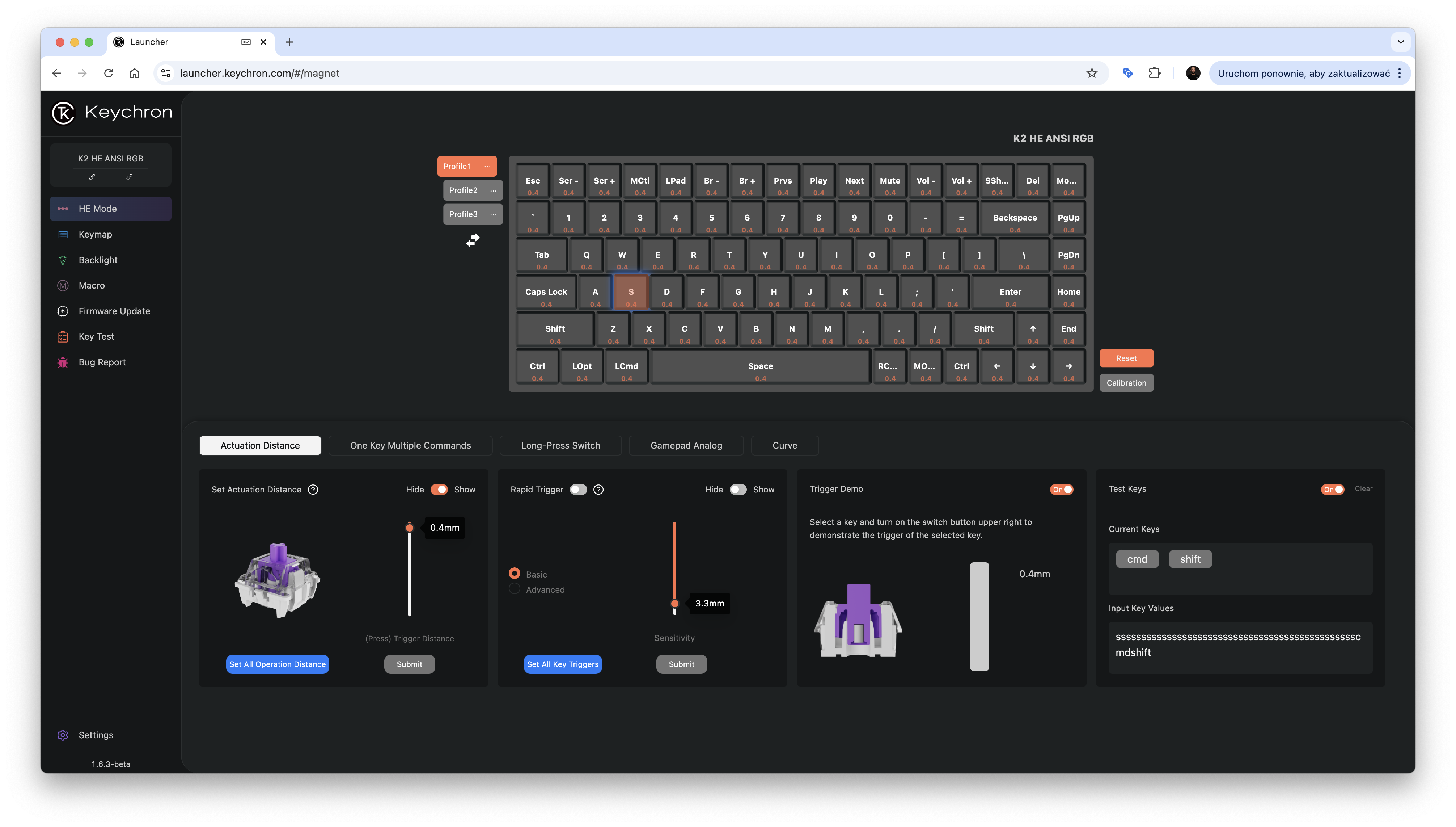 W zasadzie pytanie, które powinno Wam się pojawić w głowie po tych wszystkich moich ach-ach i och-ach, to w jaki sposób zarządzać przyciskami, skoro mamy taką możliwość? Do tego celu służy oprogramowanie Keychron Launcher, które działa… w przeglądarce. Wystarczy, że odwiedzicie adres aplikacji, podłączycie przewodem USB-C klawiaturę do Waszego komputera i będziecie mogli w pełni zarządzać tym, jak mają się zachowywać przyciski w Waszej klawiaturze: