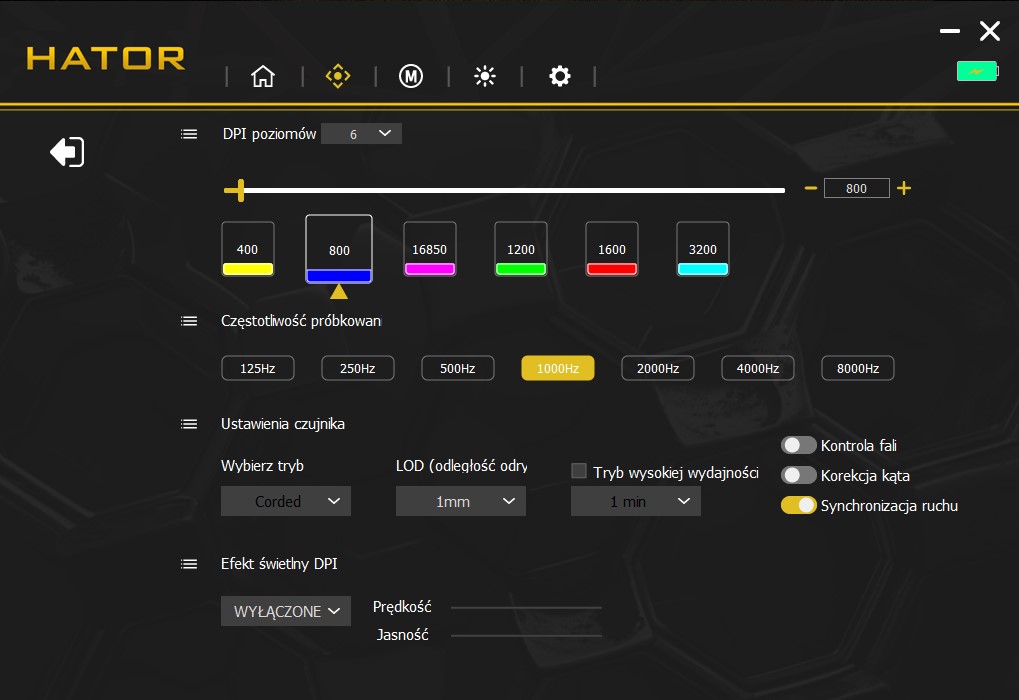 Możemy również pobrać ze strony producenta aplikację do ustawienia dodatkowych funkcji, takich jak poziom DPI (od 400 do 3200), efekty świetlne, które nie tylko obejmują kolorystykę, ale również style.