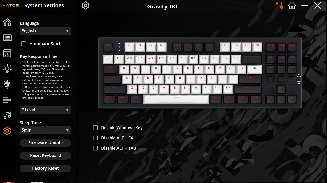 Przyciski HATOR Gravity TKL cechują się dwuwarstwowym systemem izolacji akustycznej. To jedna z cichszych klawiatur mechanicznych, jakie miałem okazję testować. Oczywiście usłyszymy charakterystyczny „klik” podczas naciskania klawiszy, ale nie jest to na pewno poziom porównywalny do maszyny do pisania. Same klawisze wykonane zostały z materiału ABS, są bardzo dobrze wyprofilowane i każdy z nich możemy wymienić.