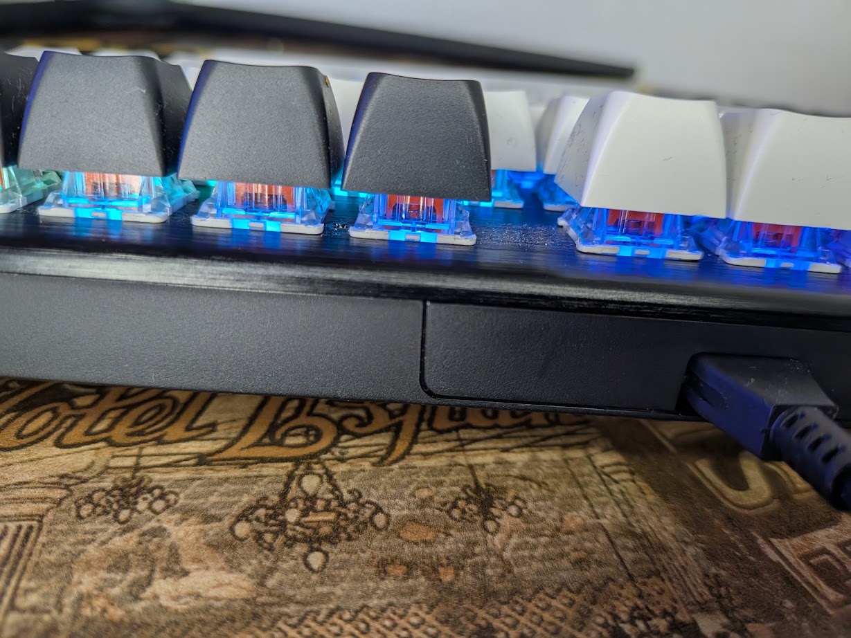 Na tle różnych innych klawiatur gamingowych wygląda to bardzo estetycznie. Szczególnie spodobała mi się sama faktura, która z daleka wygląda jak imitacja ciemnego drewna. Ponadto keycapy są ubrane w czarno-białą kolorystykę, co oczywiście cieszy, bo gdy wyłączymy oświetlenie akcesorium jawi się w stonowanej estetyce. Znajdziemy tu też trzy dodatkowe przyciski, służące do sterowania głośnością multimediów. Mały bajer, a cieszy. Szybko zmienimy też głośność i całkowicie wymutujemy dźwięk.