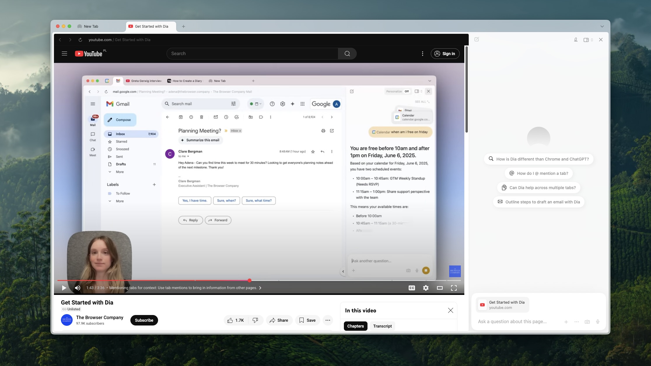 Asystent, w którego wyposażona jest Dia może mieć dostęp do konta mailowego oraz kalendarza i wyposażony w tę wiedzę pozwoli planować dzień i przygotowywać odpowiedzi na niektóre wiadomości, na przykład takie, w których ktoś pyta mnie, czy możemy spotkać się w piątek o 13 na lunch. Zamiast samodzielnie otworzyć Google Calendar w przeglądarce, wystarczy okno czatu wpisać Czy mam czas w piątek o 13?, a model AI Dia sprawdzi za mnie, czy jestem wolny w tym terminie.