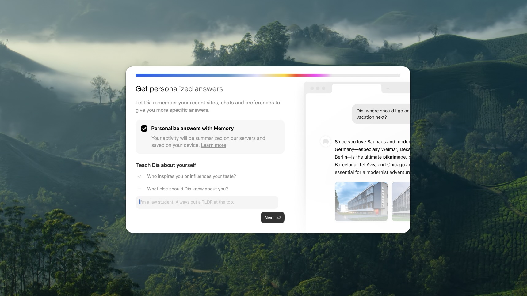 Wbudowany w Dia model AI ma w zasadzie sprawić, że użytkownik nie będzie musiał korzystać z innych rozwiązań, cała interakcja ze sztuczną inteligencją będzie odbywać się w przeglądarce, a z czasem, gdy AI zdobędzie wiedzę o użytkowniku, odpowiedzi staną po prostu lepsze, a dostępny na kliknięcie asystent niezawodny. W przeciwieństwie do Comet (która prosi tylko o e-mail), Dia wymaga założenia konta i pragnie poznać użytkownika nieco głębiej. Oczywiście na zadawane przy instalacji programu pytania można nie odpowiadać, ale zebranie większej ilości informacji ma pomóc w lepszej personalizacji.