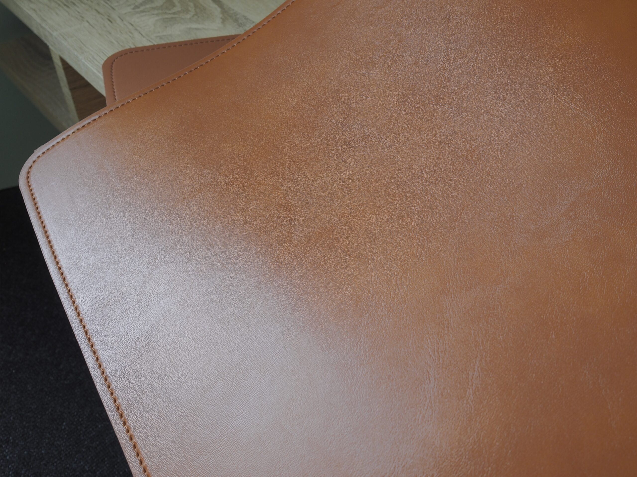 Podkładkę wykonano z wegańskiej skóry i trzeba przyznać, że materiał (poliuretan) wygląda świetnie. Z wyglądu do złudzenia przypomina naturalną skórę, a co warte odnotowania, w pierwszych godzinach miałem wrażenie, że nawet pachnie bardzo podobnie. Do dłuższym czasie aromat ulatnia się bezpowrotnie, za co jednak trudno winić producenta, po prostu jest to tworzywo sztuczne. W dotyku mata jest bardzo przyjemna i miękka, ale zachowuje do pewnego stopnia sztywność. Powiedziałbym, że balans pomiędzy tymi dwiema cechami jest w idealnym miejscu.