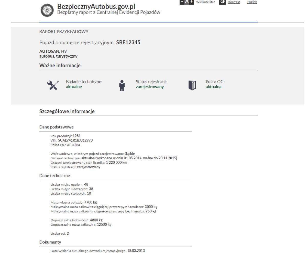 przykładowy – fikcyjny raport, wygenerowany przez stronę internetową bezpiecznyautobus.gov.pl