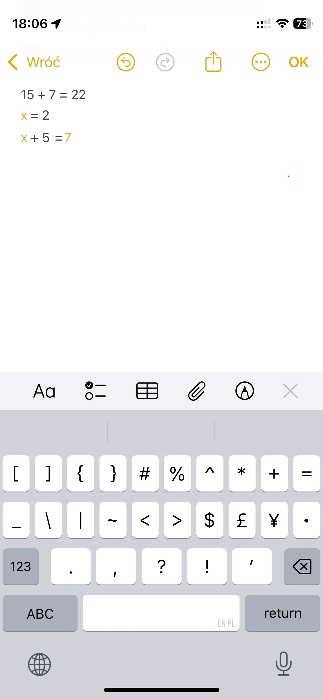 W najnowszej odsłonie iOS sporo zyskały Notatki. Do aplikacji dodano kolejne możliwości edycji tekstu, od teraz mamy opcję kolorowego wyróżniania wybranych fragmentów. Nie to jest jednak moim największym odkryciem ostatniego tygodnia. Notatki zyskały bowiem funkcje matematyczne, co oznacza, że wpisanie przykładowo „15 + 7 = ” spowoduje automatyczne pojawienie się wyniku. Co lepsze, Apple umożliwiło także stosowanie zmiennych, których ewentualna modyfikacja wpłynie na wykonane wcześniej działania.
