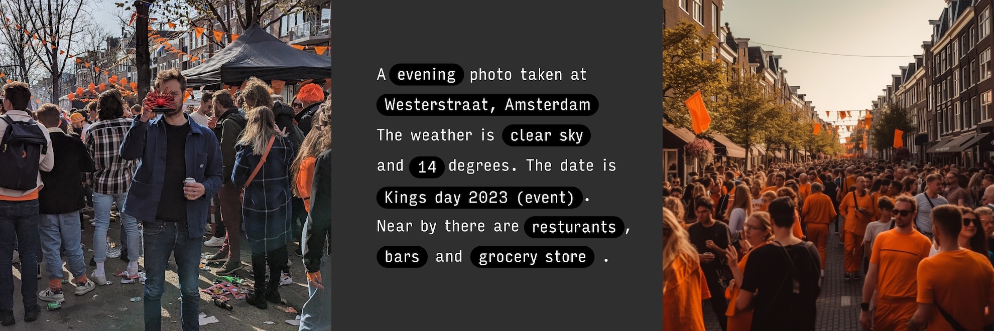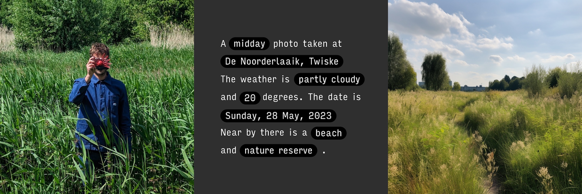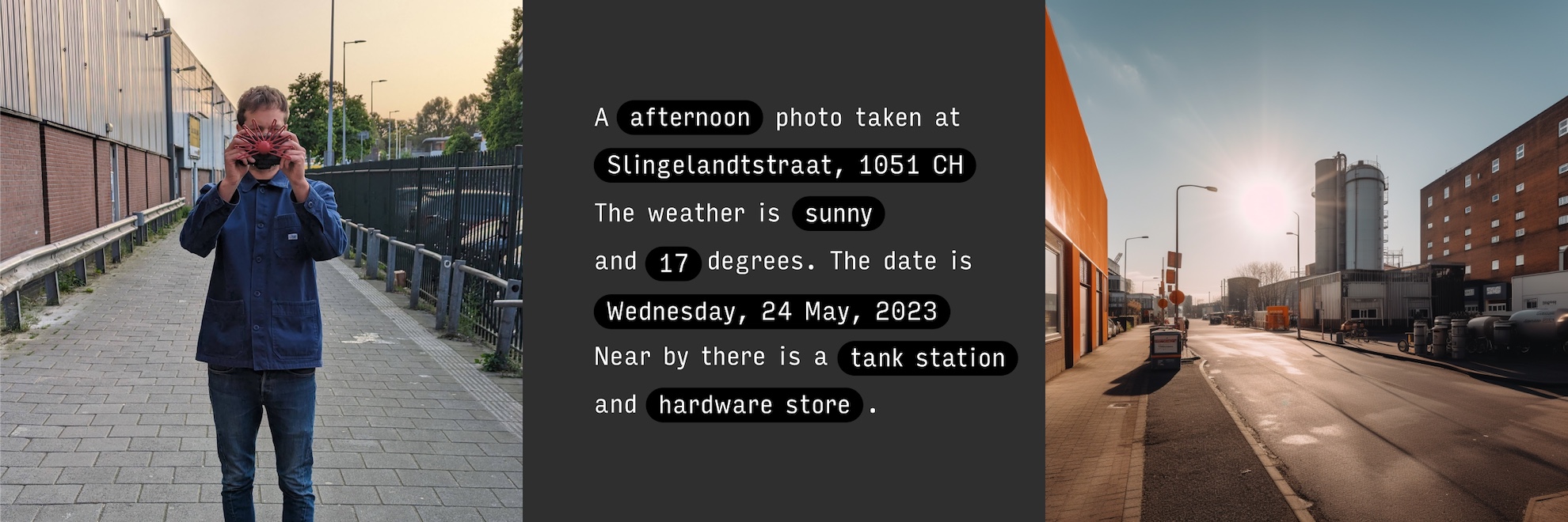 Każde zdjęcie wygenerowane jest z wykorzystaniem takich danych jak dokładna godzina, adres, aktualna pogoda, temperatura, data i wydarzenia oraz dodatkowe punkty POI.